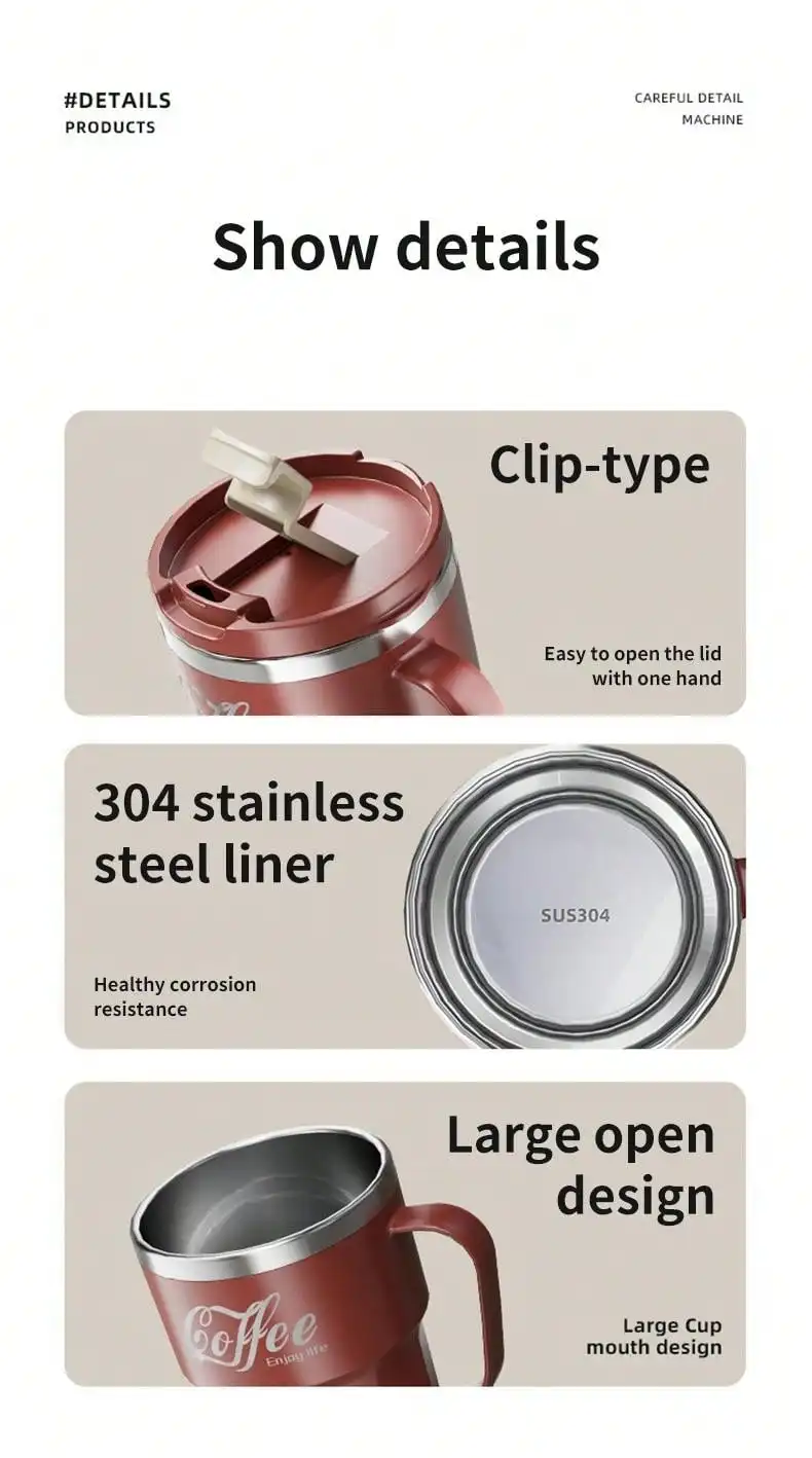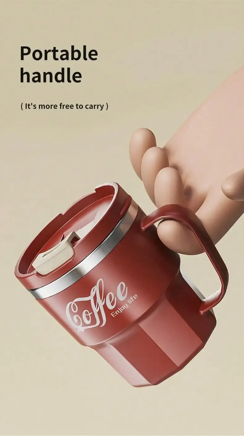 Caneca de café com revestimento duplo inoxidável, tampa e alça.